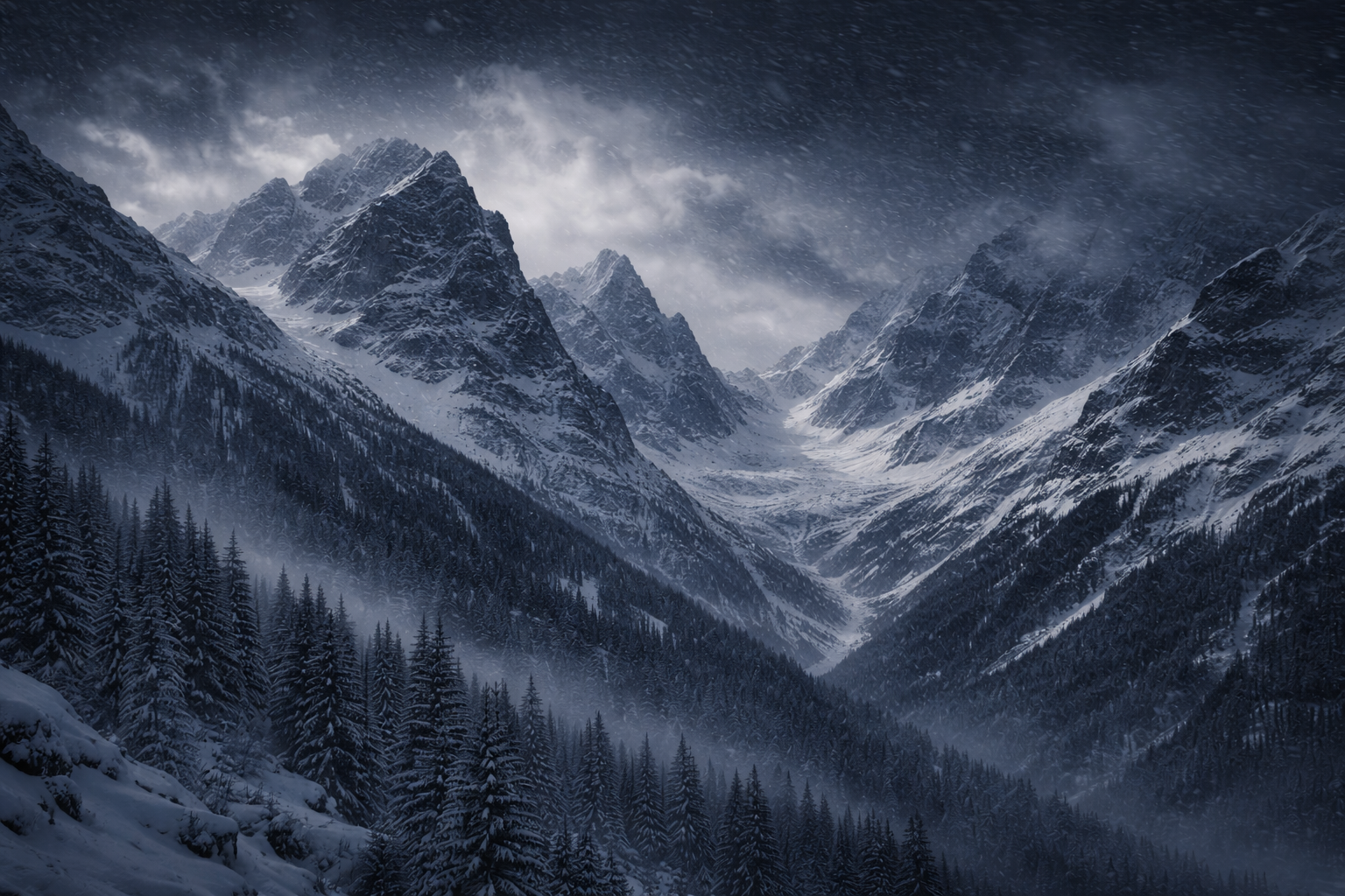 Dark Snowstorm Mountains 8K Wallpaper Dramatic Winter Landscape