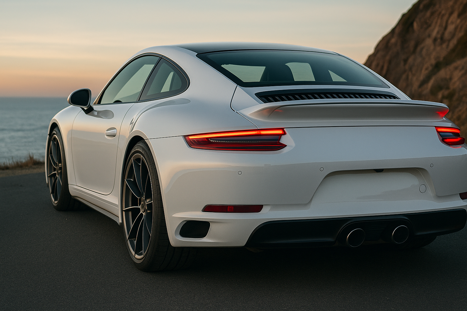 white-sports-car-cliffside-sunset-8k-desktop-wallpaper